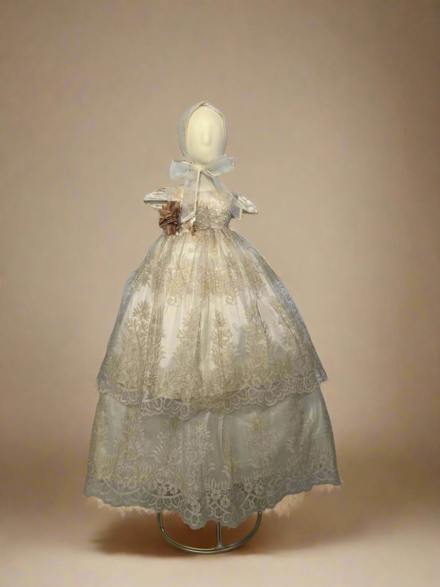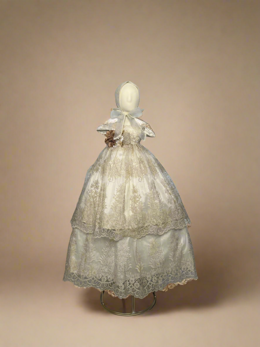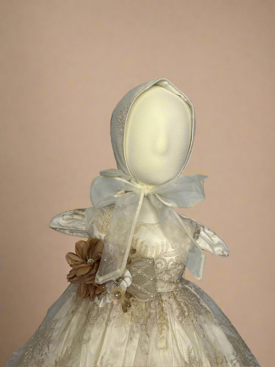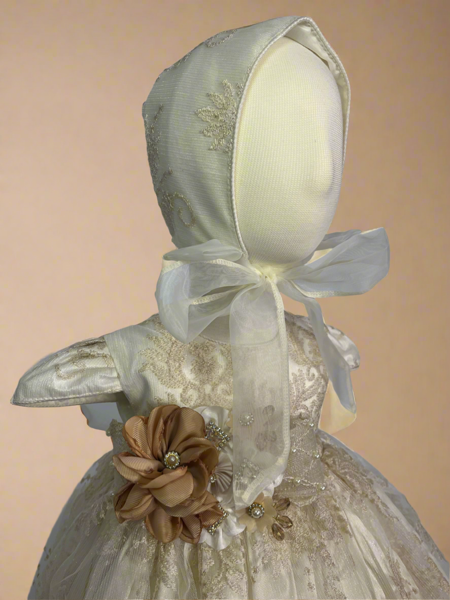 Style 1418 baptism Dress in Ivory with Champagne Lace (ONLY DRESS AND BONNET) FINAL SALE NO REFUND